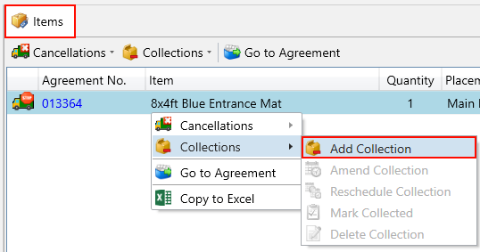 In the Items tab, right-click on the item for which you want to schedule a collection, and choose “Add Collection” from the menu.