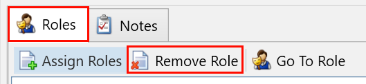 In the bottom grid, select the Roles tab and highlight the role you want to remove in the grid. Then, click the Remove Role button.