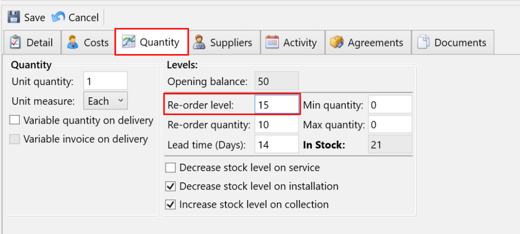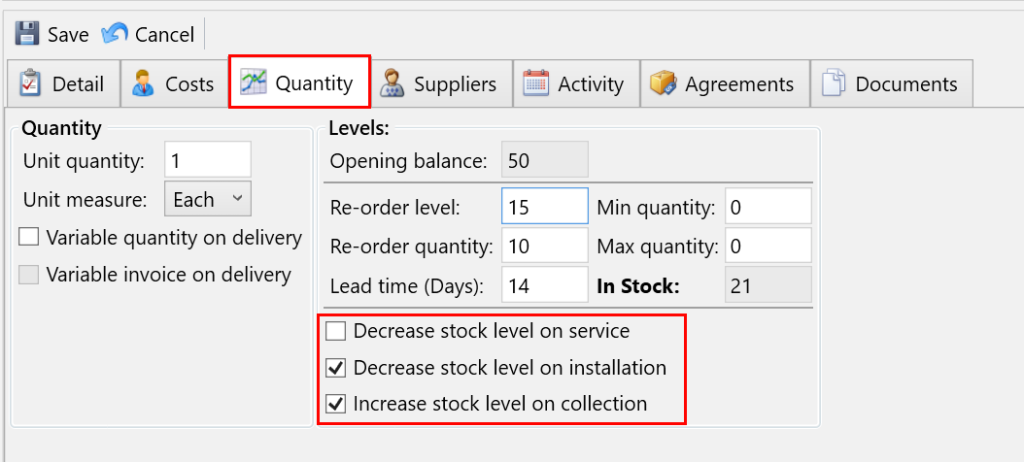 - Decrease stock level on service – This will reduce the in-stock quantity for this stock item whenever this item is serviced as part of a regular delivery, a one-off delivery or as a re-visit.
