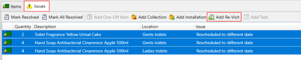 With your job still selected in the top grid, change to the Issues tab at the bottom of the screen. You will see all of the items for the job displayed, select them all and then press the Add Re-Visit button.