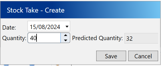 In the popup, select the date the stock take was performed and the quantity counted. The currently recorded in stock amount is also shown as the expected quantity.