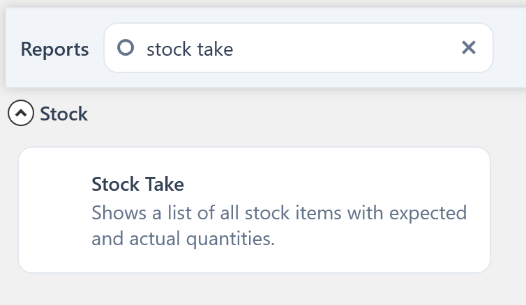 You can find the Stock Take report by searching for it on the Reports screen from the main toolbar.