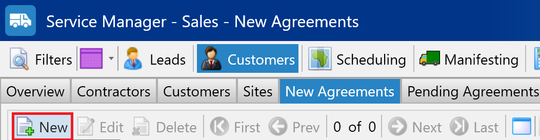 All agreements begin in the New Agreements tab under the Customers section, allowing you to create new agreements for both new and existing sites.