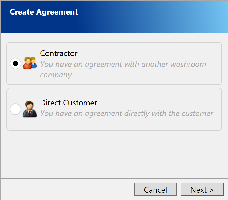 The Create Agreement popup will appear. Here you can choose between setting up a Contractor or a Direct Customer.