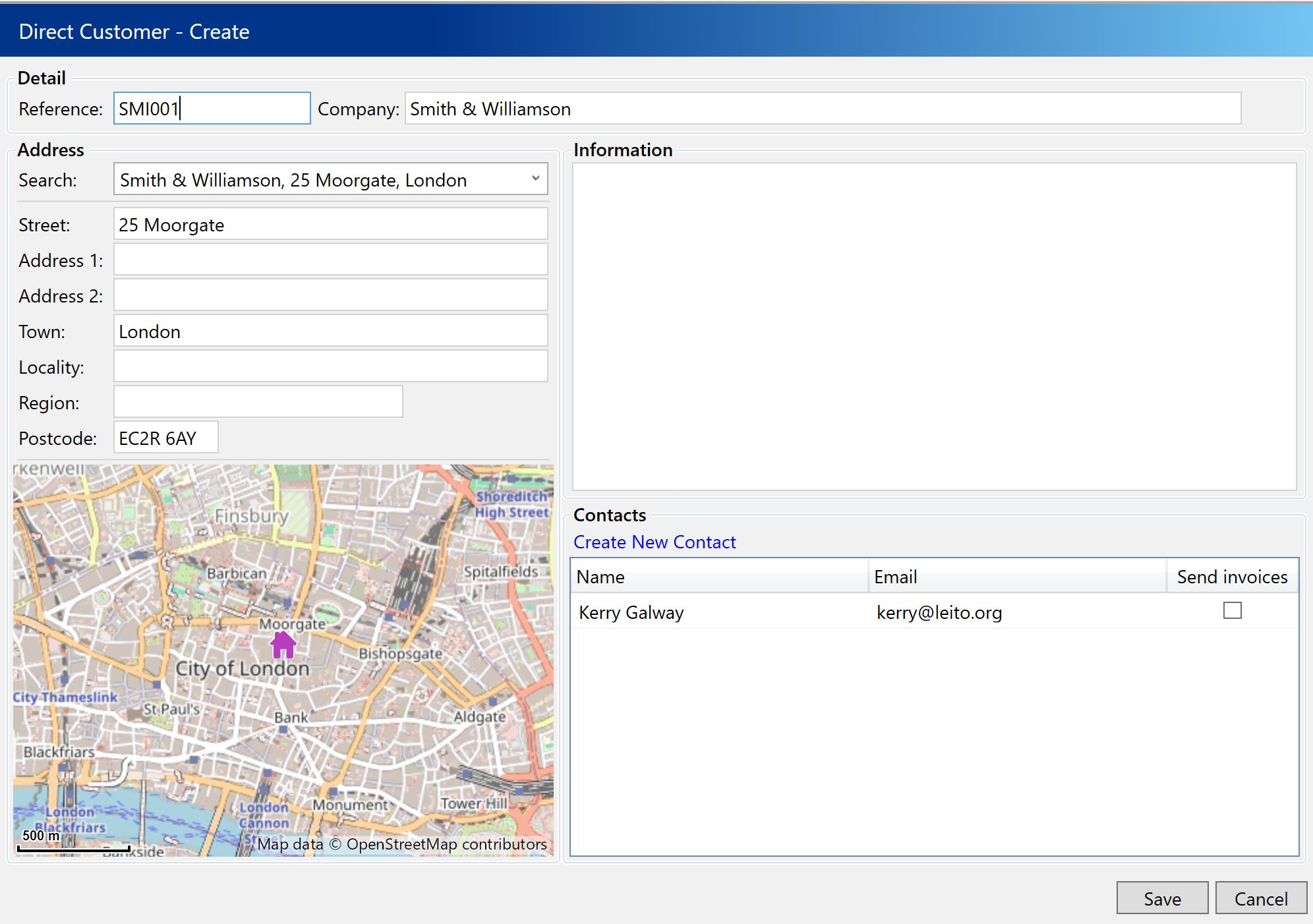 If you clicked “Create New” you will see the page above. Here you can either manually enter the company address information or use the search box to lookup the address. Make sure you add a site Reference and a Main Contact and then click Save.