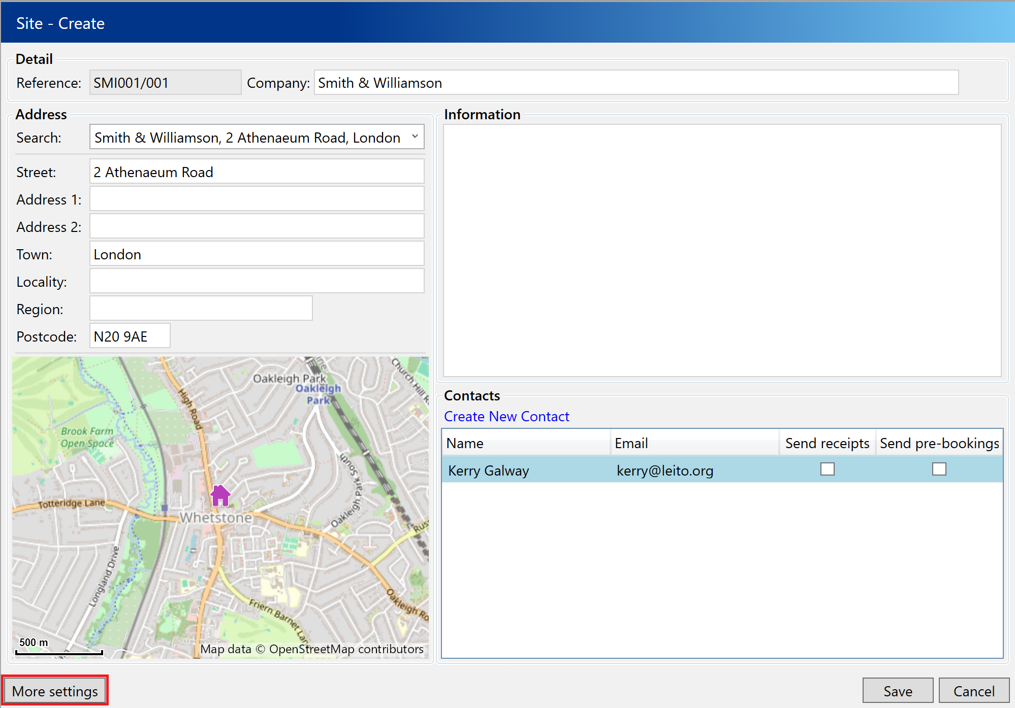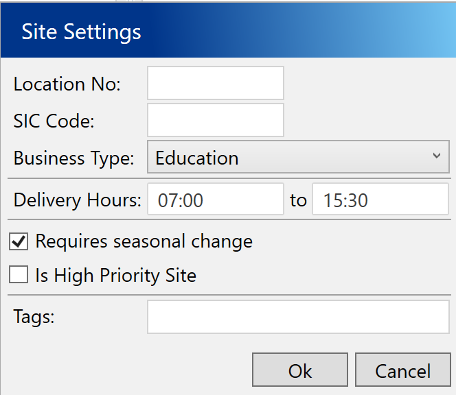 If your site has specific access times or seasonal opening hours for deliveries you can click the More Settings button and add these here.