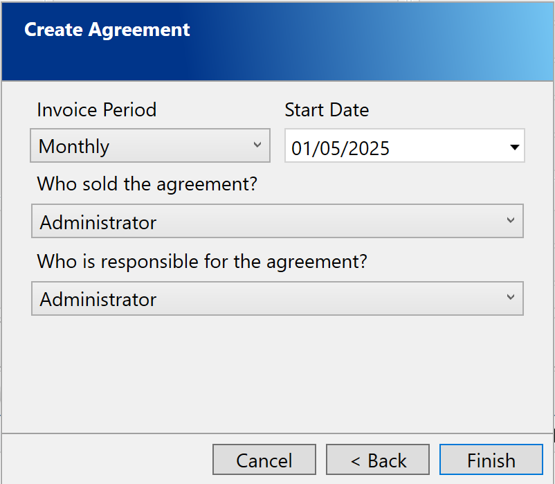 On this final page you can select your Invoice Period and Start Date for the agreement. You should also assign a member of staff as responsible for this agreement.