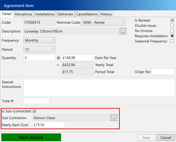 Create or amend an item on an agreement. In the popup, you can enter the sub-contractor details for this item in the sub-contractor section.
