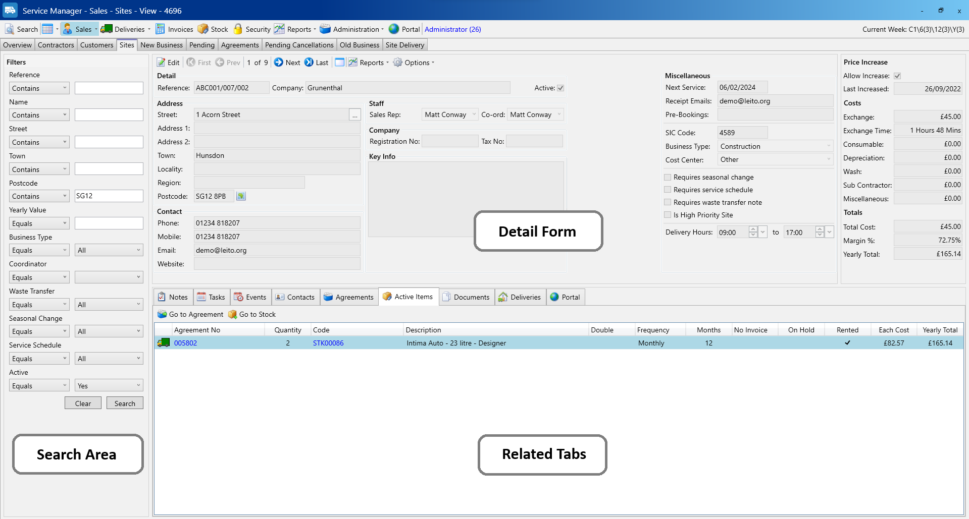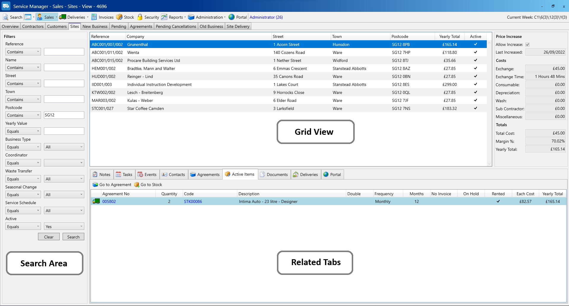 In the screenshot above, you can see we have used the postcode filter in the Search Area to find all active sites with an SG12 postcode. The results are displayed in the Grid View and the first result is automatically selected and at the bottom the Related Tabs display information for that selected result. In this case the Active Items tab is showing all of the items on the selected “Grunenthal” site.