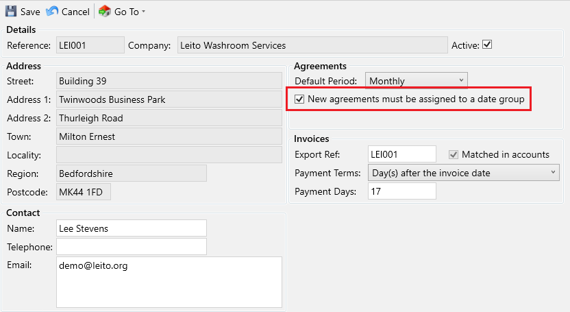 In the details window, click the Edit button, then check the box for “New Agreements must be assigned to a date group,” and click Save. From now on, when an agreement on this account is made live its invoice dates will be required to be synchronised.