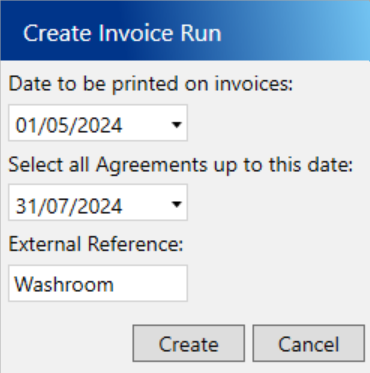 An Invoice Run invoices active agreements up to a specified date. You can select specific agreements to include in each Invoice Run. For example, if your company operates multiple branches, you might prefer to conduct separate invoice runs for each branch.