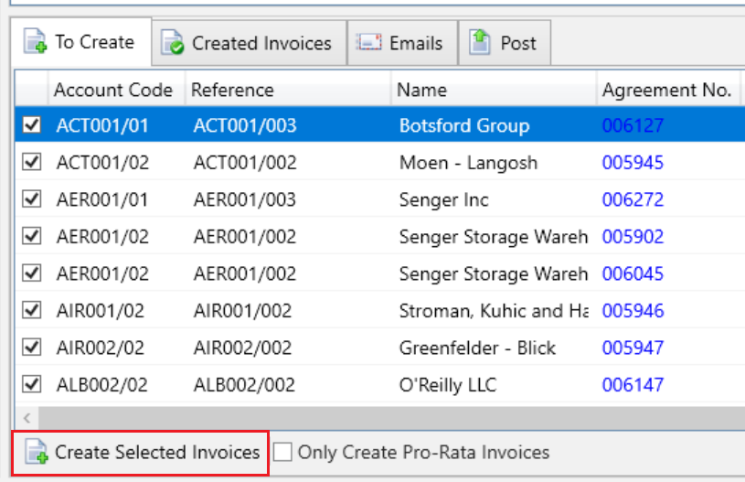 Once you have selected the agreements for which you want to generate invoices, click the “Create Selected Invoices” button at the bottom of the grid.