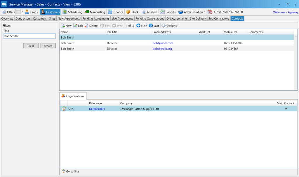 - The list shows all contacts in the system, regardless of which customer or site they are linked to
