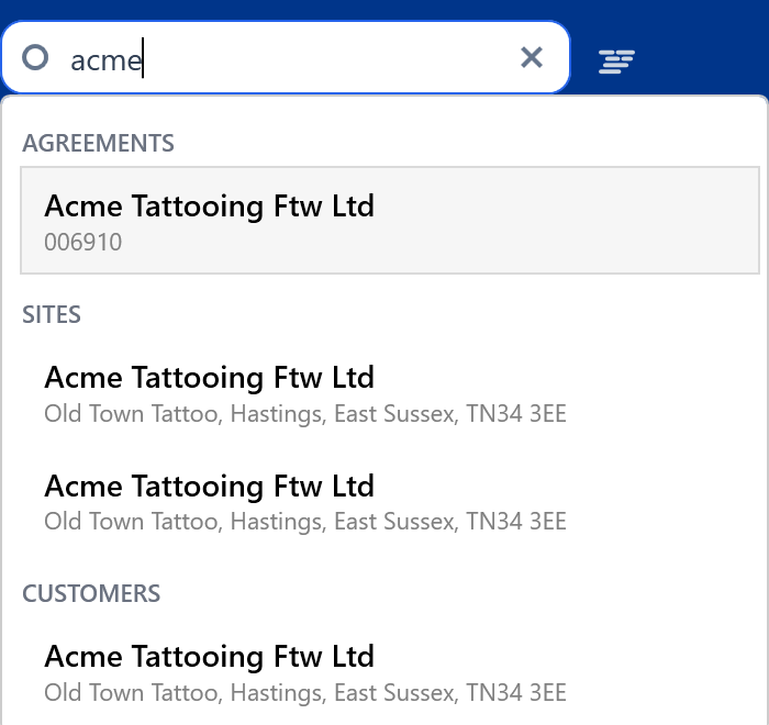 Results are grouped by screen, such as Customers, Sites, or Agreements, so you can immediately see where the record lives. Click a result to jump straight to the correct screen.